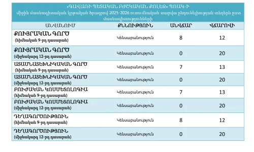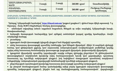 2025-2026 ուսումնական տարվա ՀՀ նախնական (արհեստագործական) և միջին մասնագիտական կրթական ծրագրեր իրականացնող ուսումնական հաստատությունների ընդունելության հայտագրումը մեկնարկելու է 2025 թվականի հուլիսի 24-ից։ ՄԿՈւ հաստատություններ դիմելու համար անհրաժեշտ է լինելու հայտագրվել Կրթական տեխնոլոգիաների ազգային կենտրոնի https://dimord.emis.am/ կայքում: