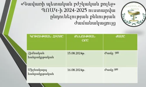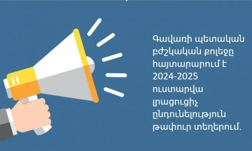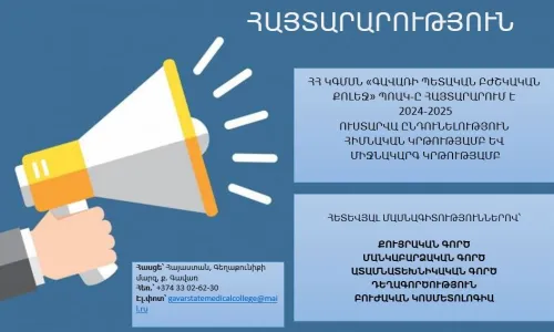 Գավառի պետական բժշկական քոլեջը հայտարարում է 2024-2025 ուստարվա լրացուցիչ ընդունելություն թափուր տեղերի համար հետևյալ մասնագիտությունների գծով՝Քույրական գործ (հիմնական, միջնակարգ)Ատամնատեխնիկական գործ (հիմնական, միջնակարգ) Դեղագործություն (հիմնական, միջնակարգ) Կոսմետոլոգիա (հիմնական, միջնակարգ)Թափուր տեղերի ընդունելությանը կարող են մասնակցել «…