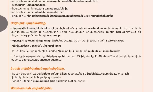 ՀԱՐԳԵԼԻ՛ ՈՒՍԱՆՈՂՆԵՐՍերգեյ Փարաջոնովի 100-ամյակի կապակցությամբ ՀՀ կրթության, գիտության, մշակույթի և սպորտի նախարարությունը և Սերգեյ Փարաջանովի թանգարանը համատեղ հայտարարել են «Մեր ու բոլորի Փարաջանովը» խորագիրը կրող մրցույթ՝ դպրոցների 8-12-րդ դասարանների աշակերտների և նախնական (արհեստագործական) և միջին մասնագիտական ուսումնական հաստատությունների ուսանողների համար:Մրցույթի պայմաններն…
