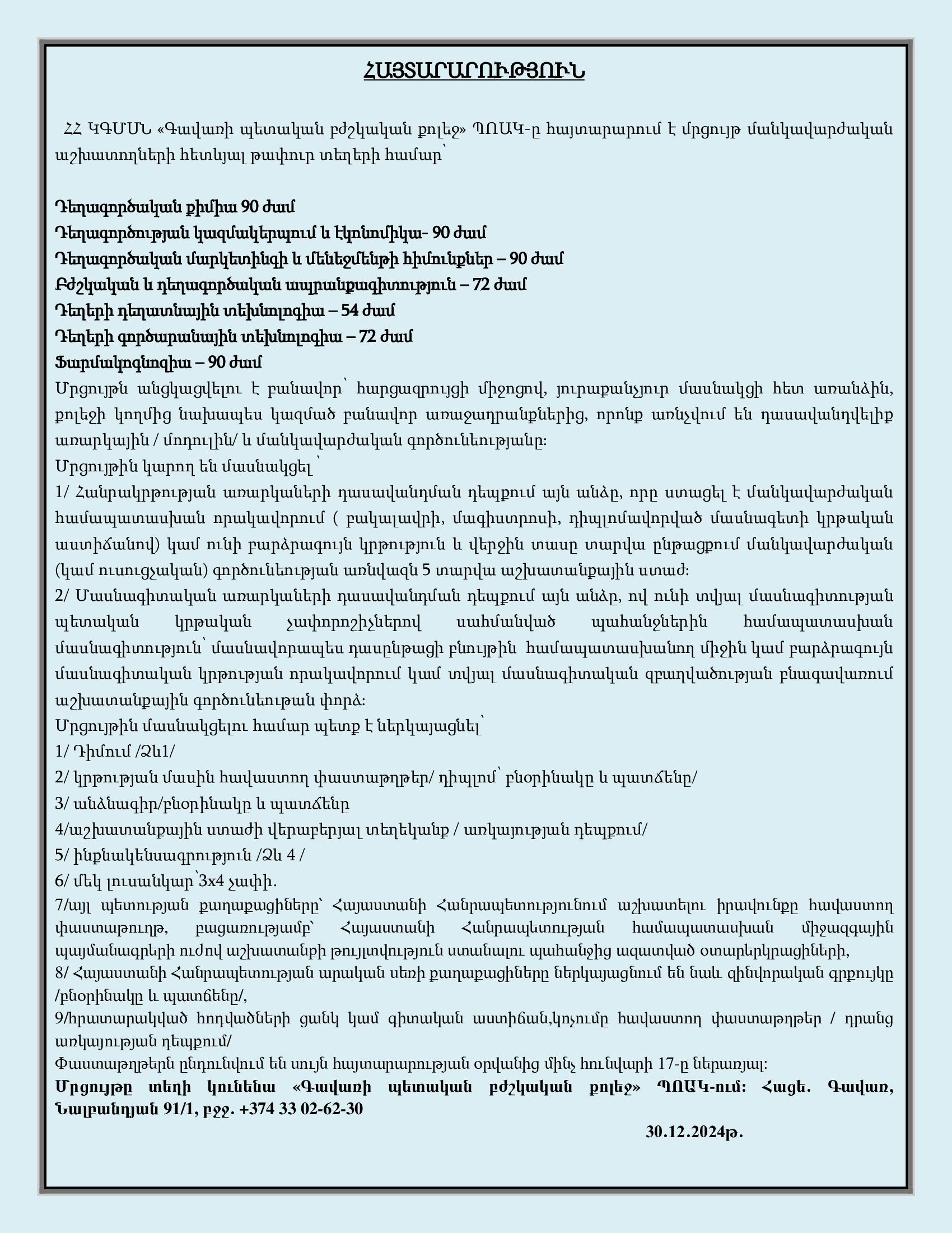 ՀՀ ԿԳՄՍՆ <<Գավառի պետական բժշկական քոլեջ>> ՊՈԱԿ-ը հայտարարում է մրցույթ մանկավարժական աշխատողների թափուր տեղերի համար։