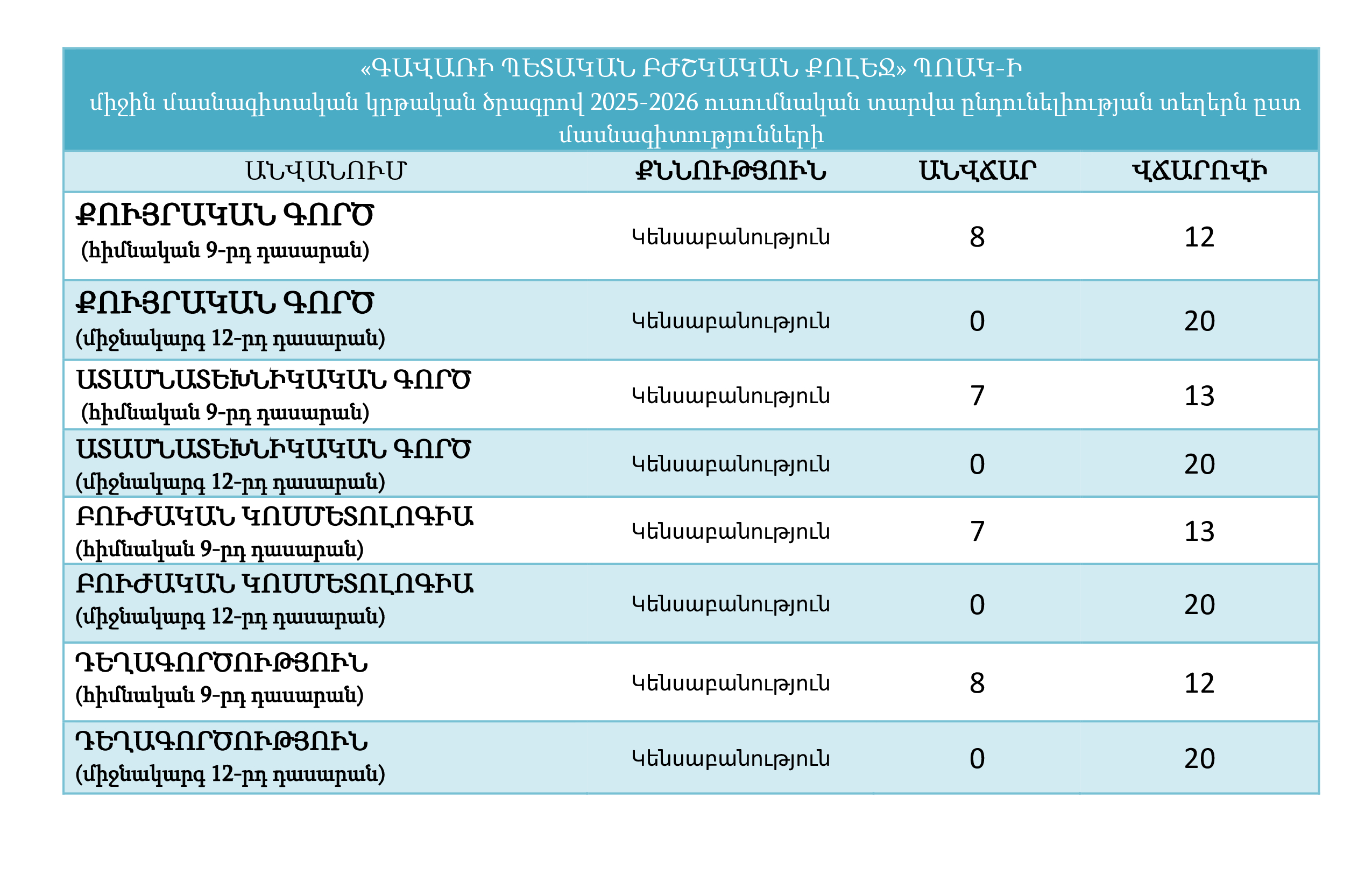 🎓🩺«ԳԱՎԱՌԻ ՊԵՏԱԿԱՆ ԲԺՇԿԱԿԱՆ ՔՈԼԵՋ» ՊՈԱԿ-Իմիջին մասնագիտական կրթական ծրագրով 2025-2026 ուսումնական տարվա ընդունելիության տեղերն ըստ մասնագիտությունների 🩺