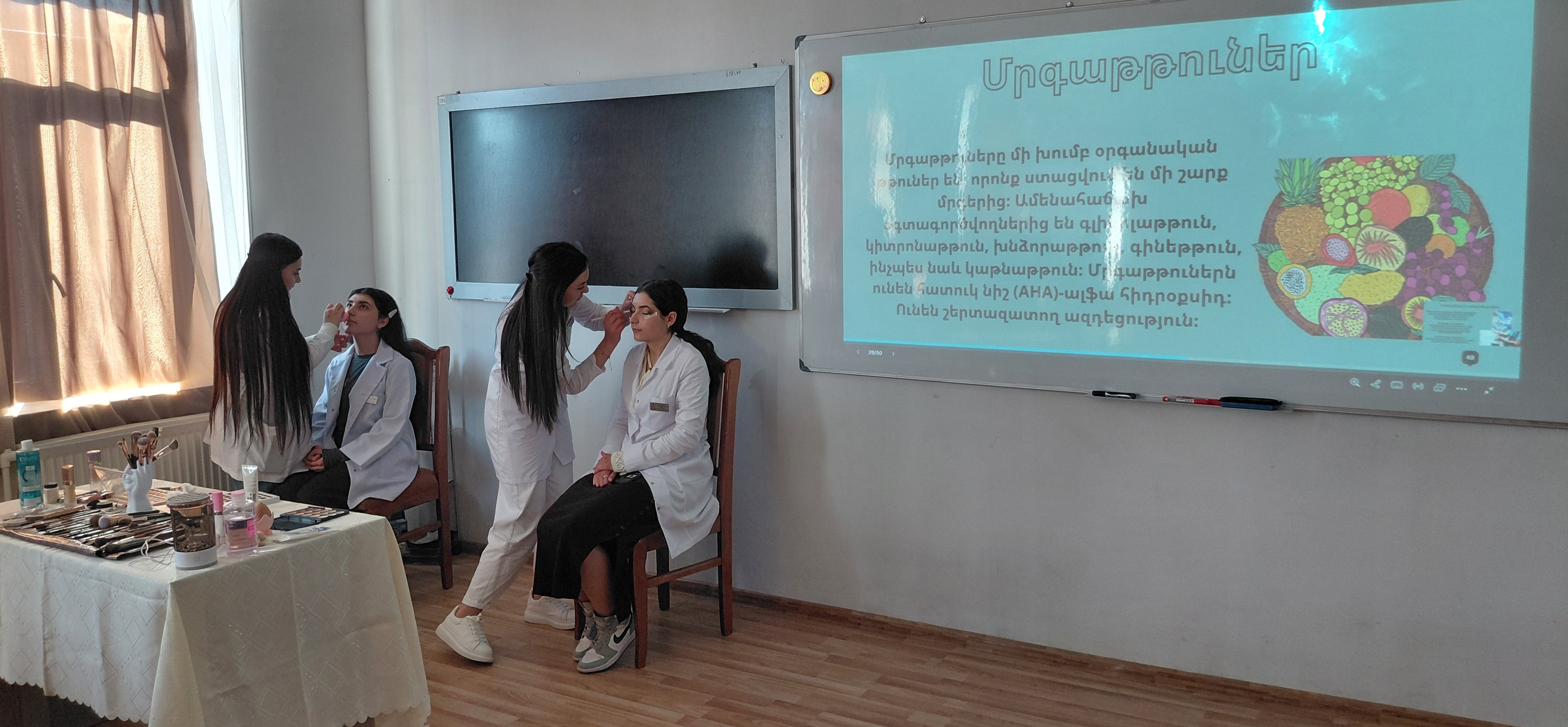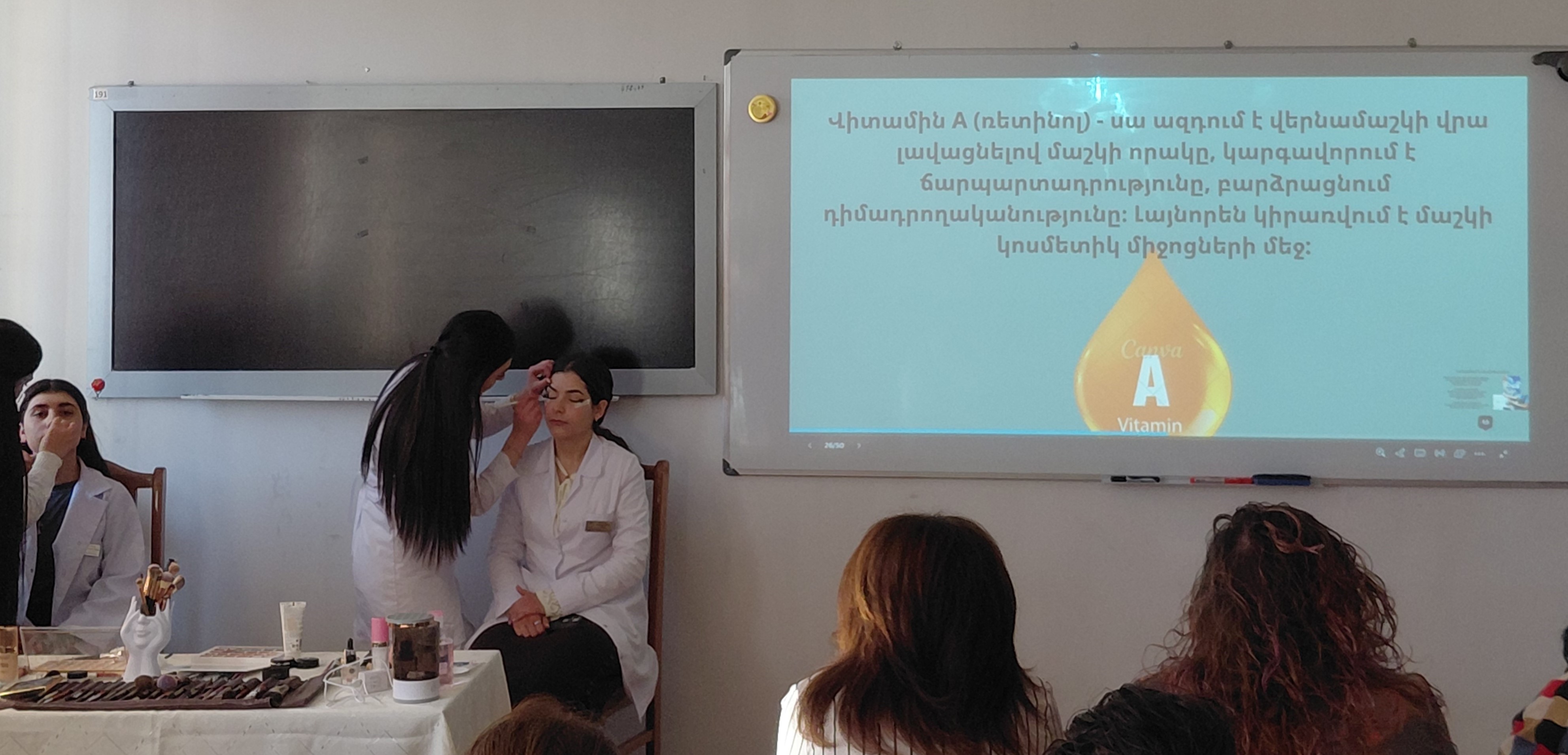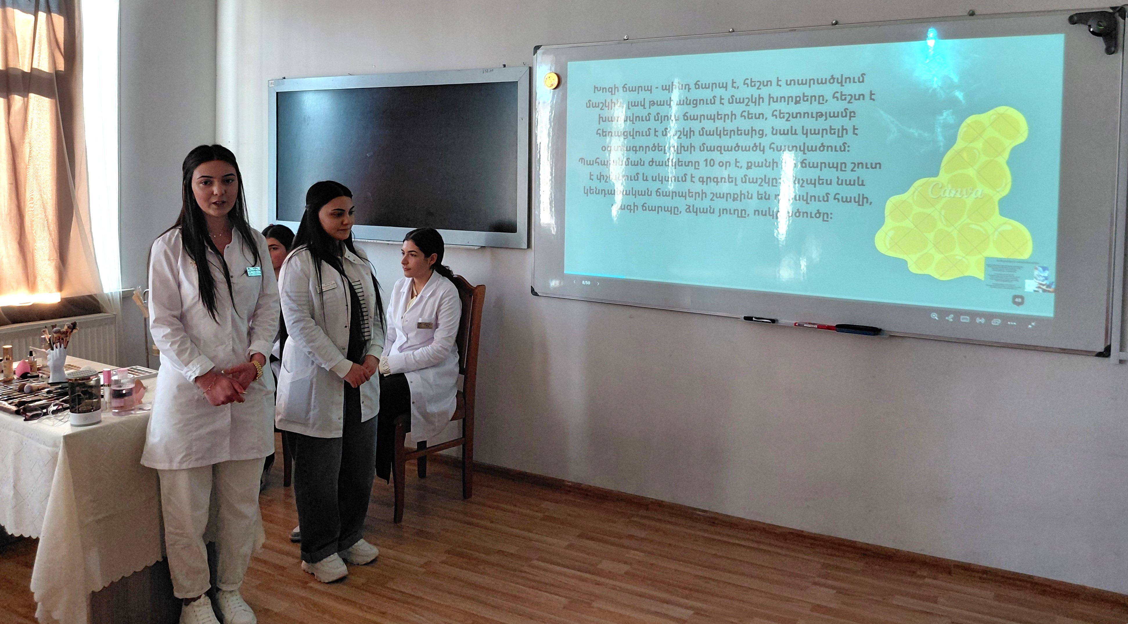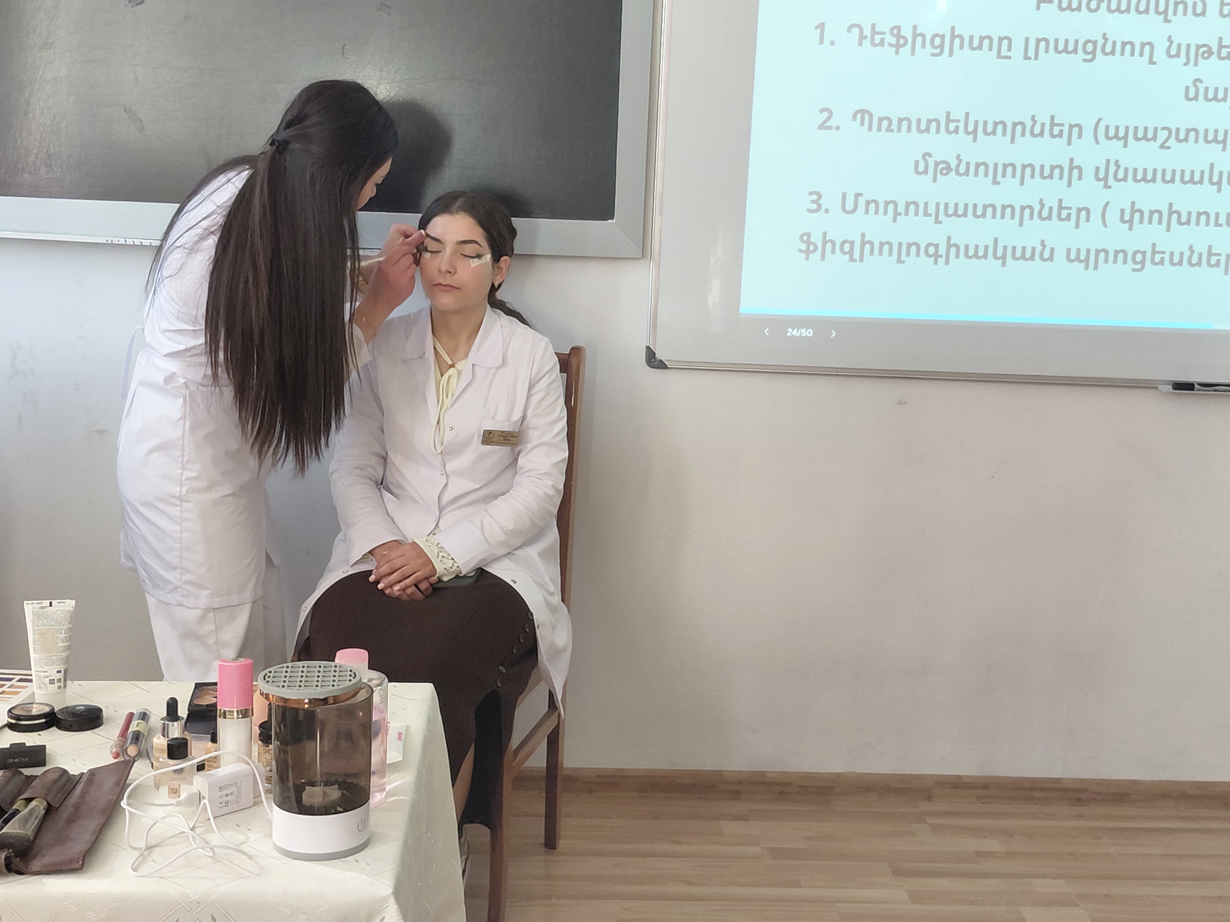 Ուսանողները մոդուլների ամփոփման արդյունքում ներկայացրեցին իրենց պատրաստած անհատական աշխատանքները, ինչպես նաև գործնականում ցուցադրեցին դիմահարդարման հմտություններ՝ ընդգծելով դիմահարդարման արվեստի նրբություններն ու ստեղծագործական մոտեցումները։